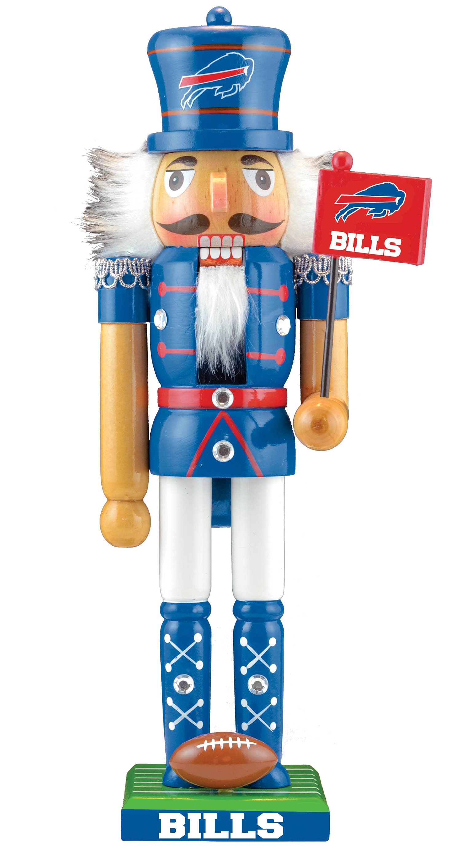 This collectible NFL nutcracker features solid wood construction and is beautifully hand-crafted to represent your favorite team. Show your team pride this holiday or sports season. Features team colors, a football and team flag, hair, and gems.