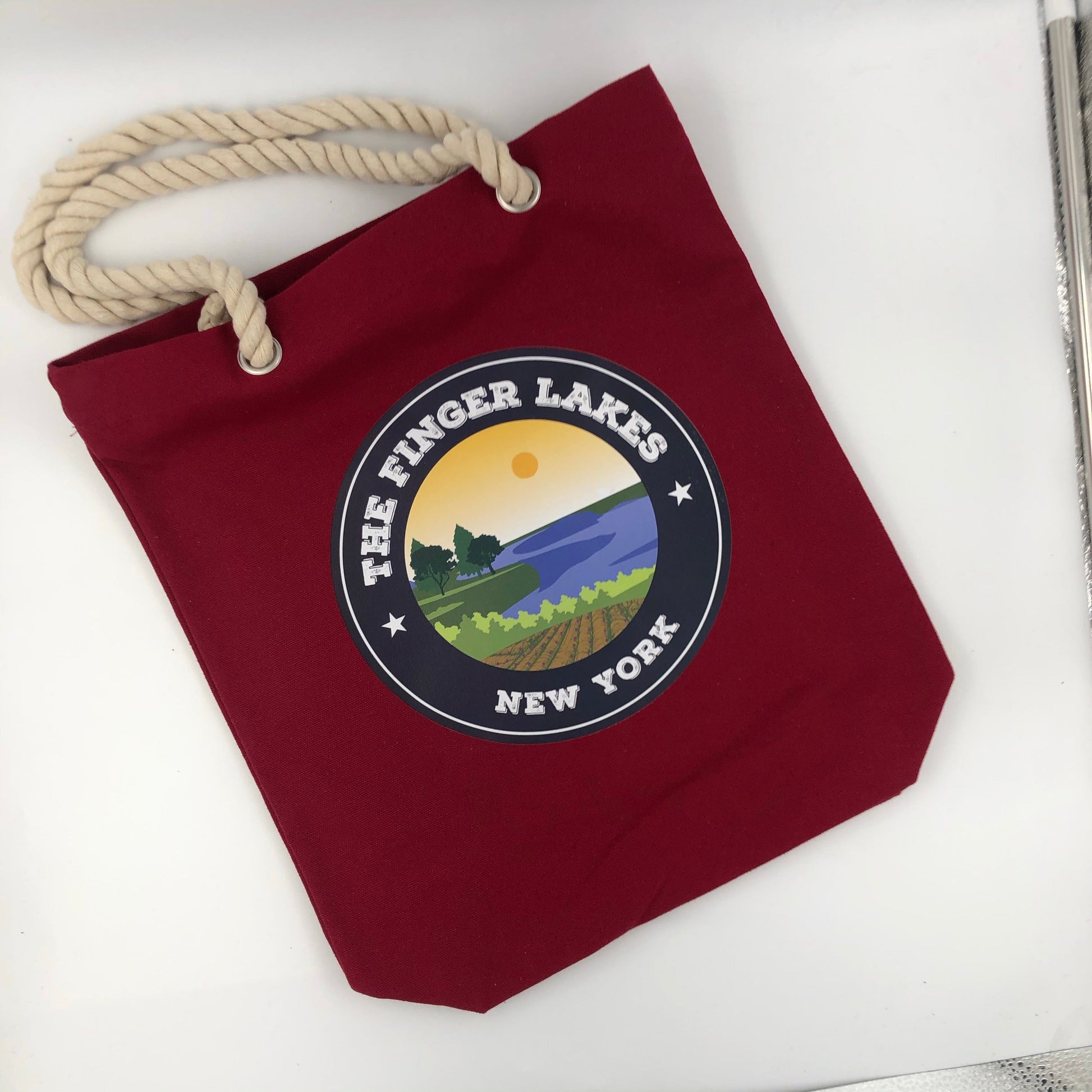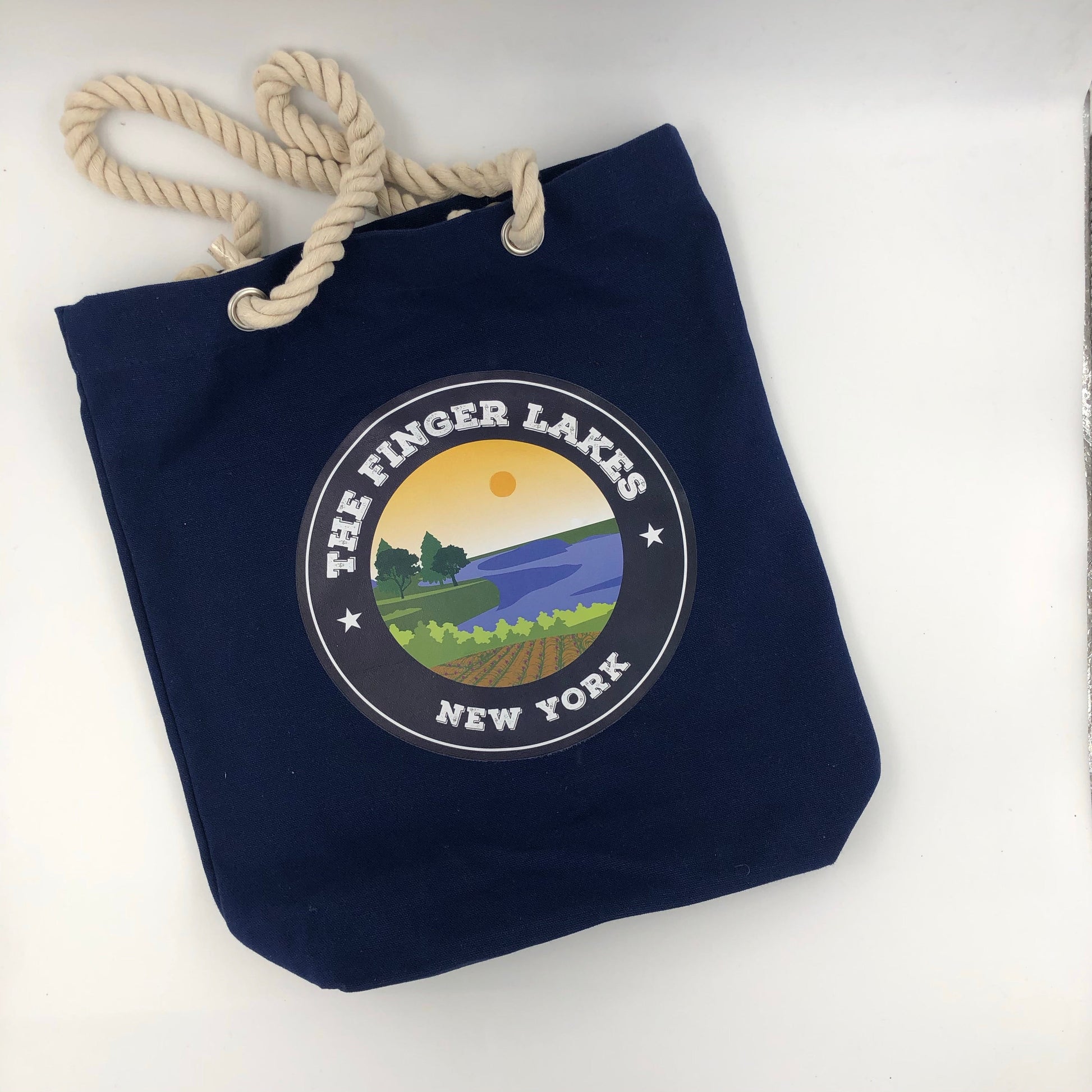 Versatile, every day tote bag to use for the market, including a small inside pocket. Great for carrying stuff for kids, work, going to the gym, or just about anything where you'd like. A high quality, sturdy bag with the logo of the Finger Lakes. Large size / 19.5"x18".