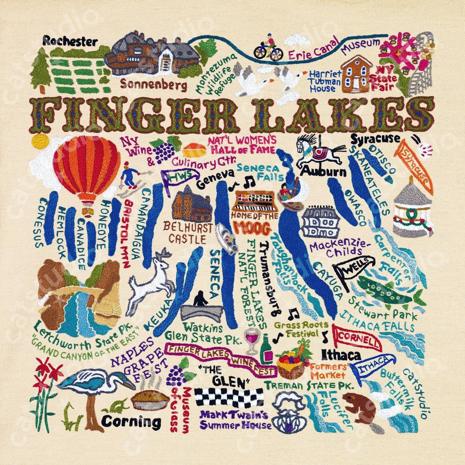 Exclusive Finger Lakes hand-embroidered art map! This artwork is hand-embroidered, scanned using state-of-the-art equipment, and then artfully printed in the USA on crisp, museum-quality paper - perfect for framing! What makes them extraordinary: each art print is prepared by hand and signed by our printing staff on the insert card. Product details Printed with archival inks using a giclee printing process.