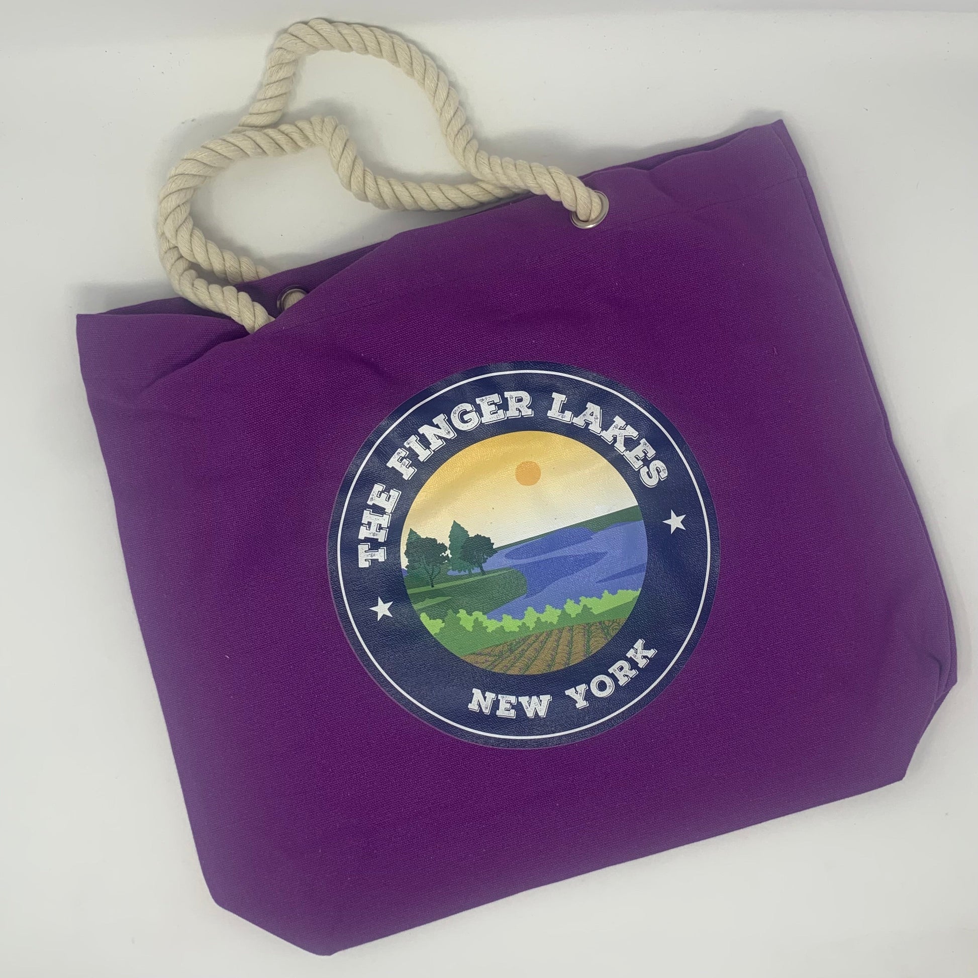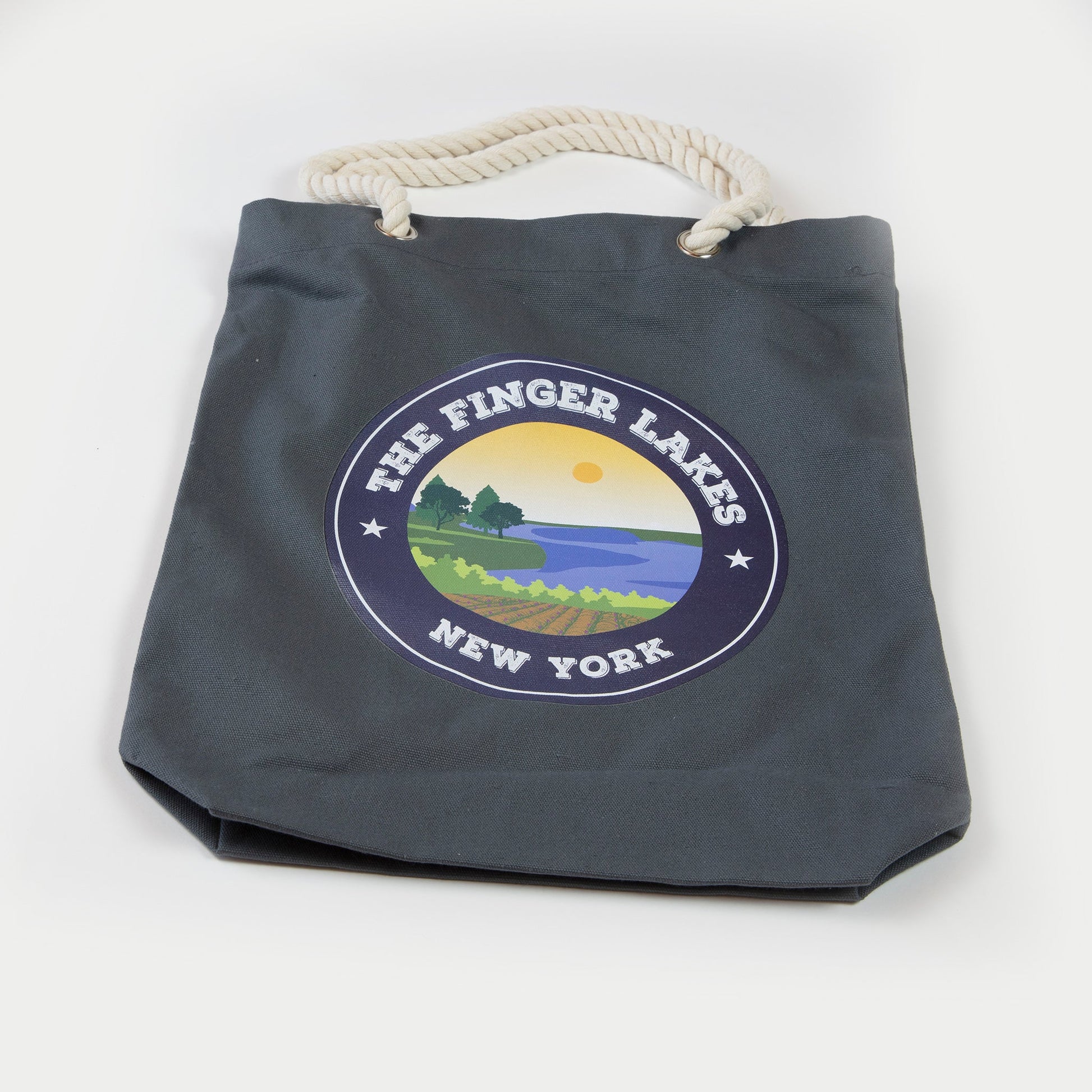 Versatile, every day tote bag to use for the market, carrying kids stuff, stuff for work, going to the gym, or just about anything where you'd like a high quality, sturdy bag with the logo of the Finger Lakes. Medium size / 13"x15".