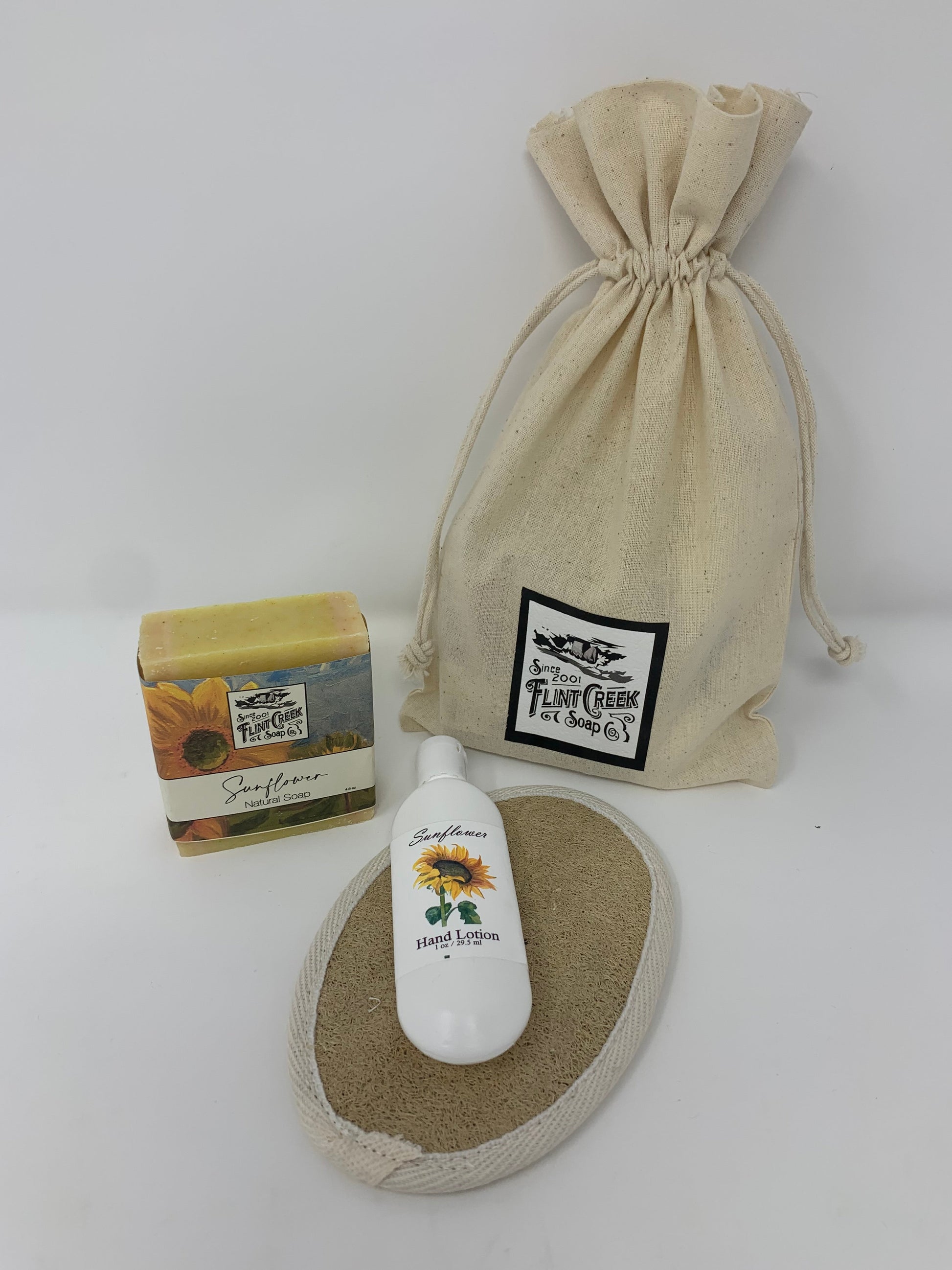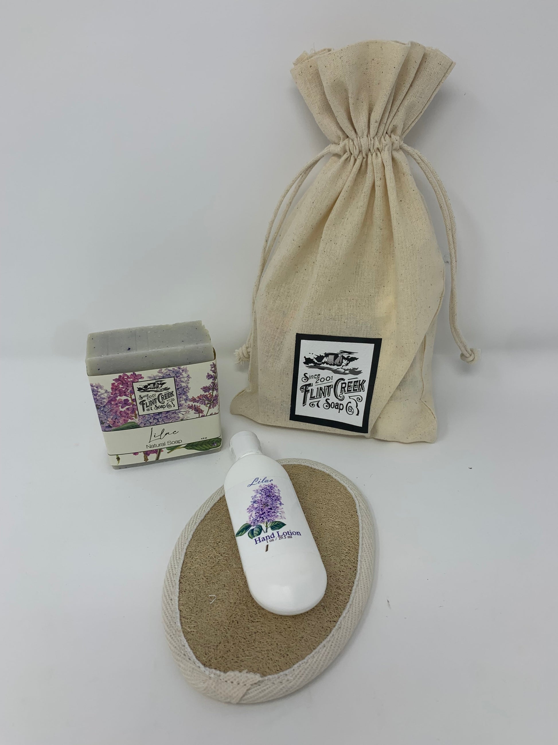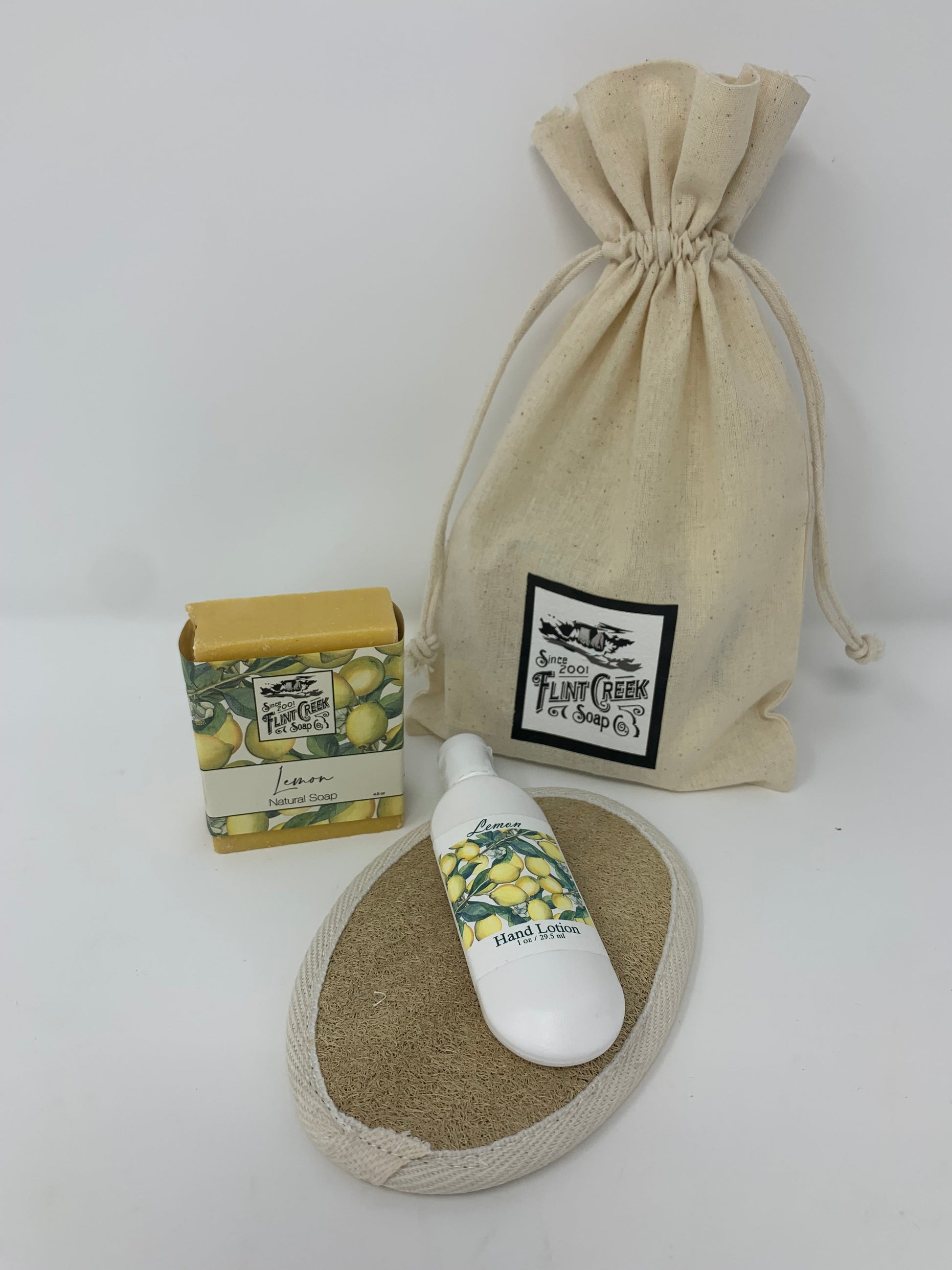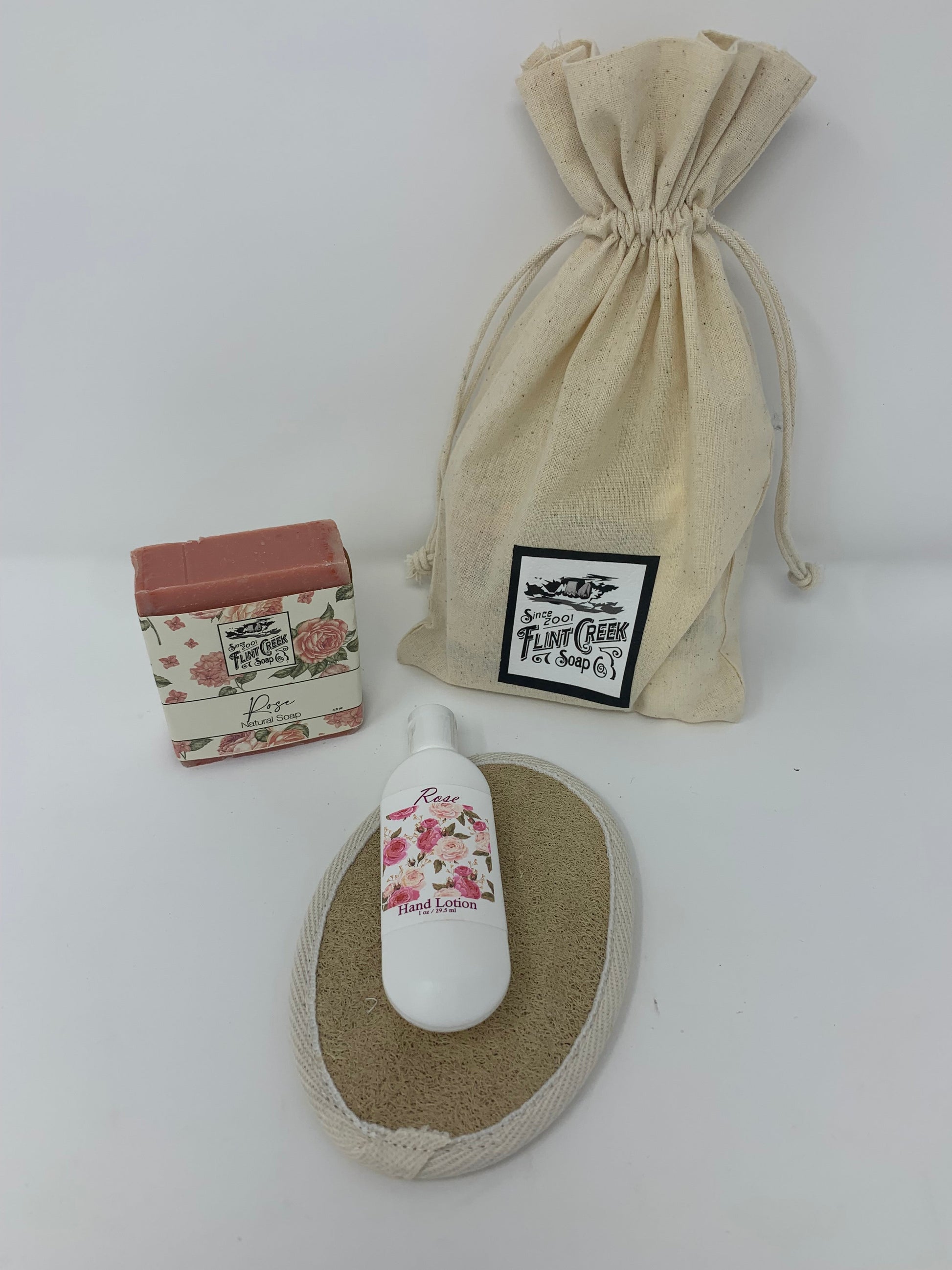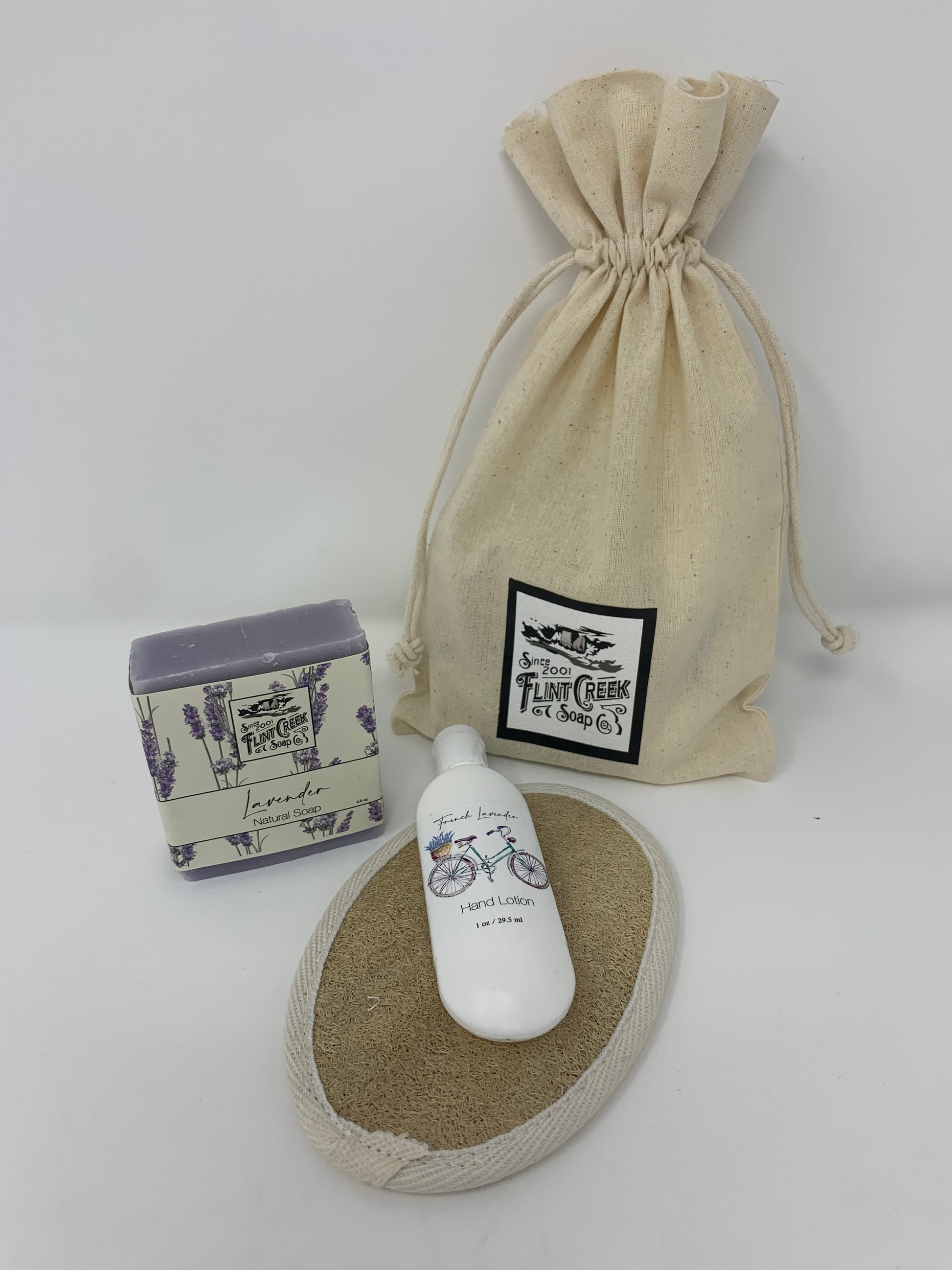 The Flint Creek amenity kit features a flint creek bar soap and a travel-sized lotion accompanied by a Finger Lakes Goods Loofa. This small but delightful package comes in a Flint Creek drawstring bag.
