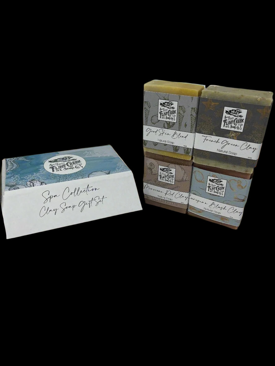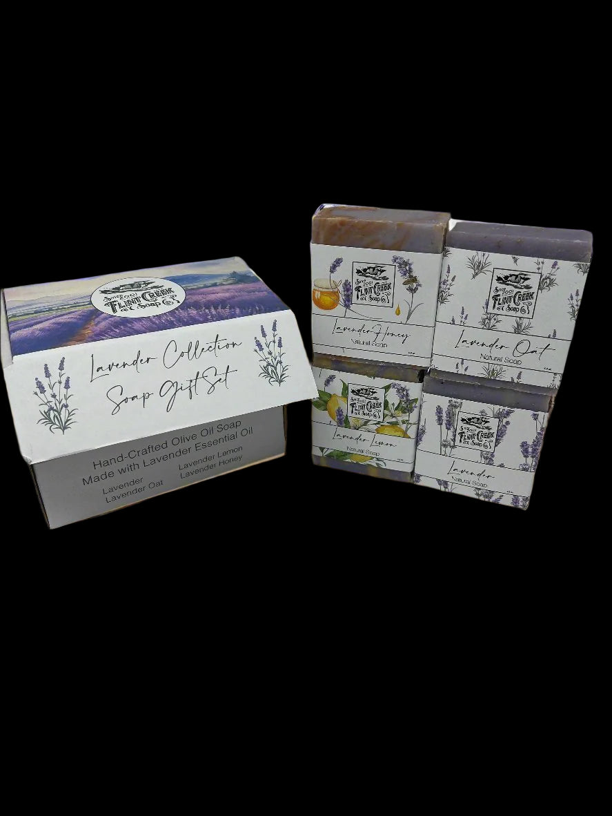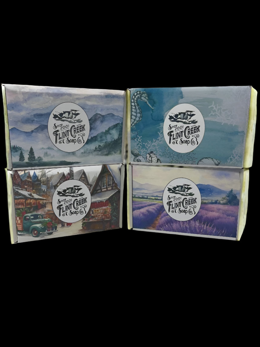Special gift boxes of hand-made olive oils soaps made by Flint Creek. Comes in a beautiful gift box with four soaps.