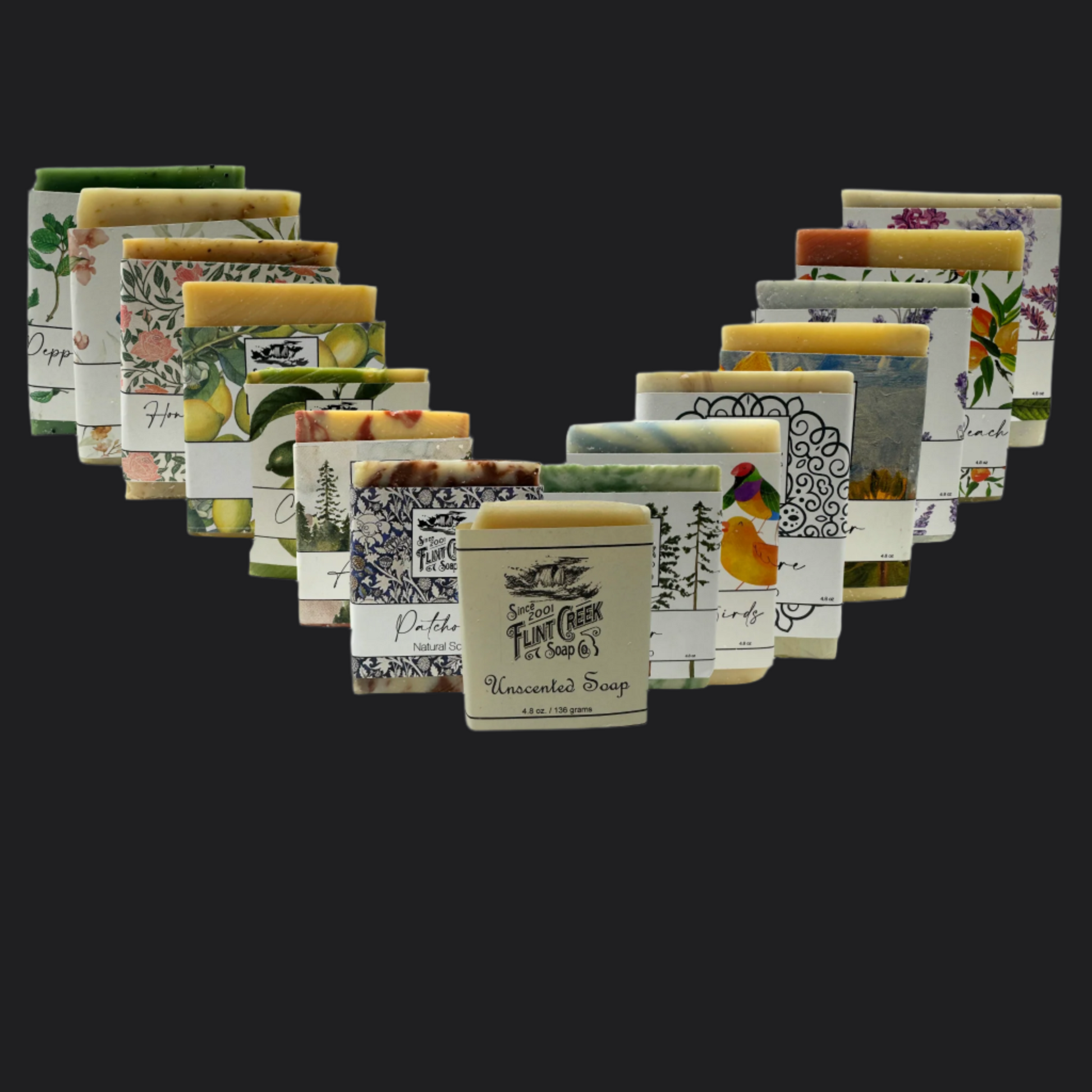 Flint Creek Soaps are hand crafted with pure oils. Olive oil is the base for all of our soaps making for a frothy thick lather and a harder, longer lasting bar. Natural soaps cleanse without drying or leaving a greasy feel. And they are great for environment. Made with simple ingredients for highly effective cleansing. No plastic packaging, no harmful detergents, lathering agents, dyes no soy, no palm oil. Check out the wide range of scented and unscented options.