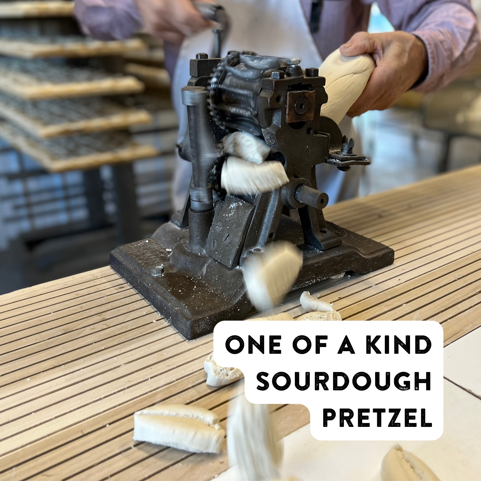 Using the same techniques since we started in 1935, we've been twisting each delicious, sourdough pretzel sourcing our ingredients from small farms in the Northeast. Our pretzels begin with a simple—and secret—sourdough recipe of flour, water, yeast, and salt. Our bakers then hand-roll and hand-twist each and every pretzel.