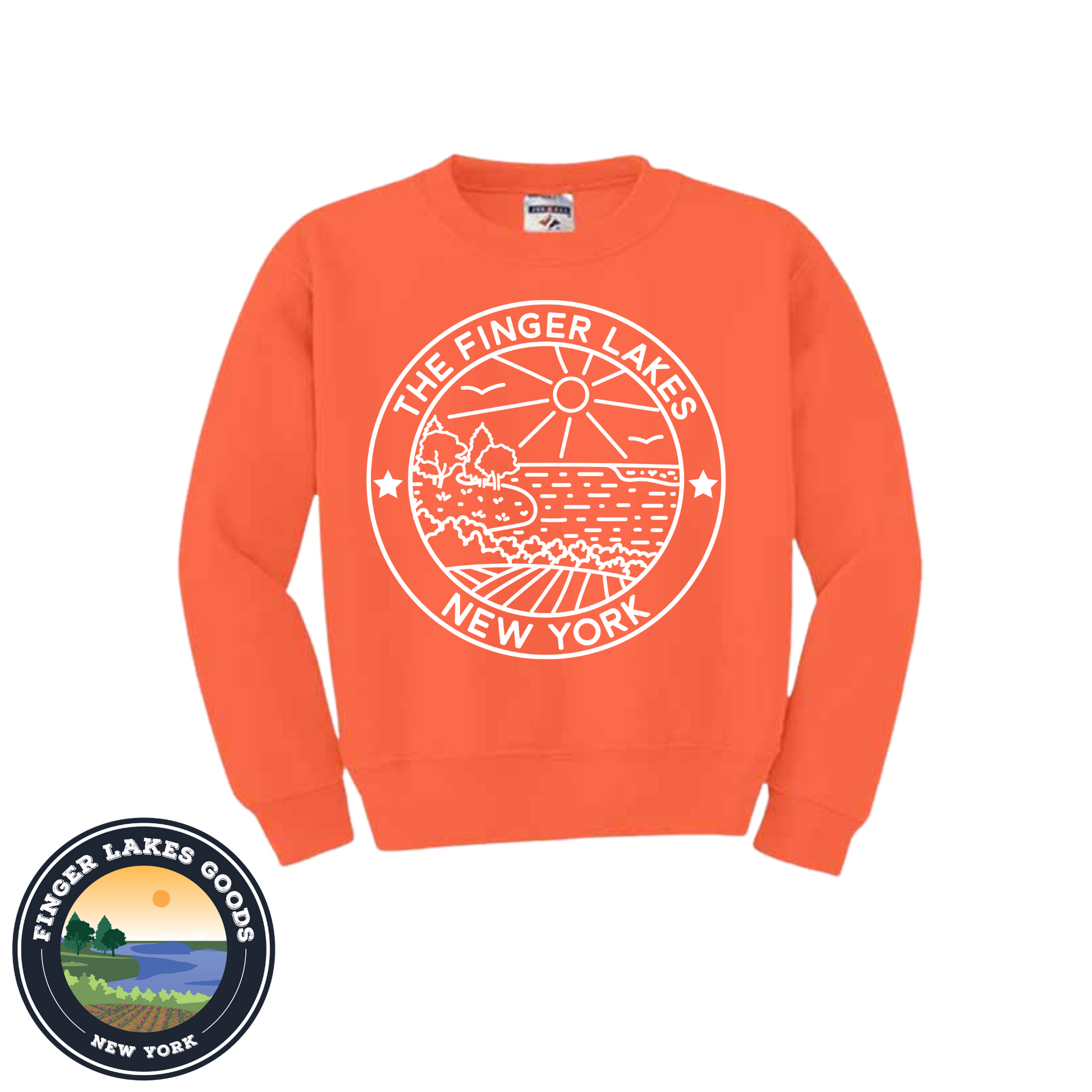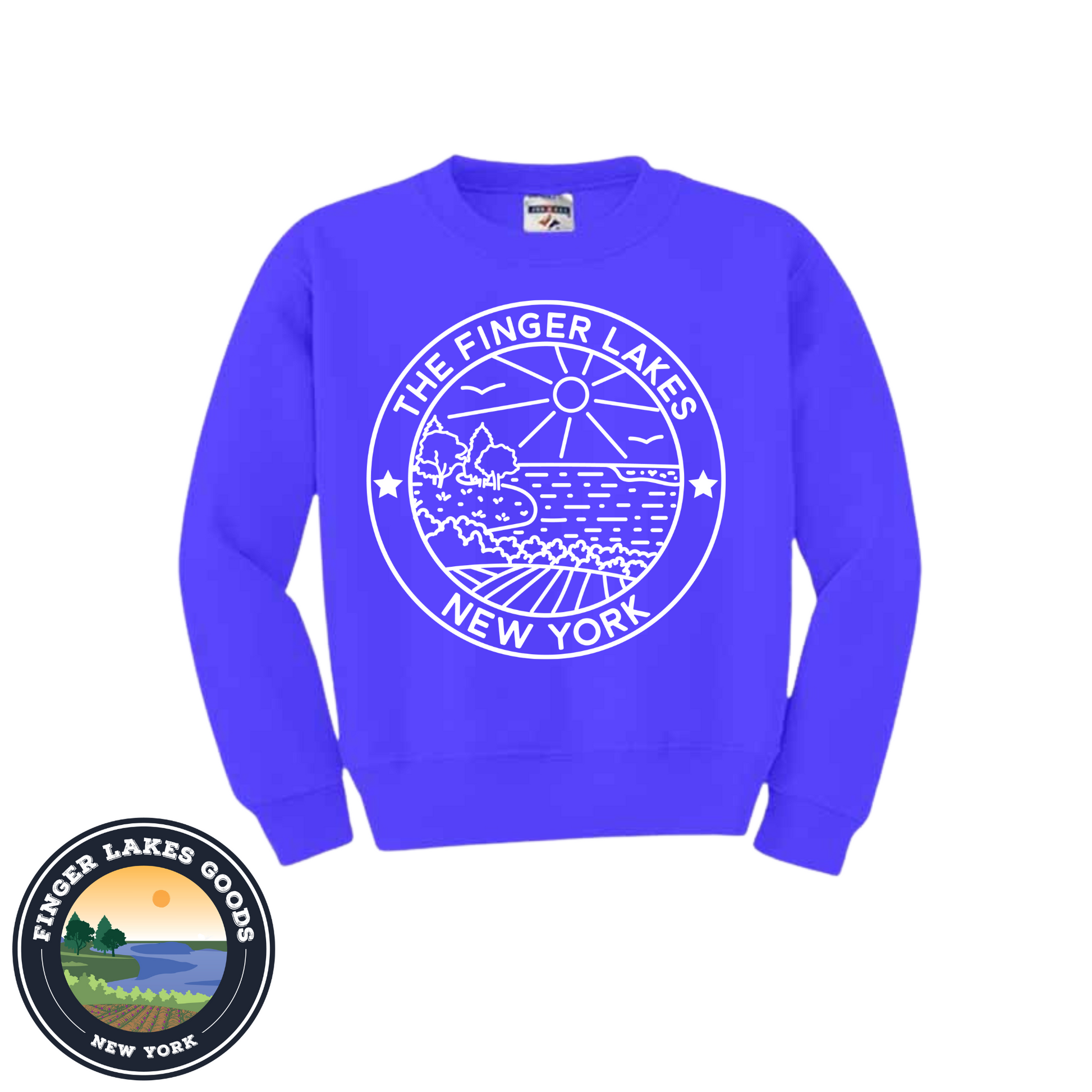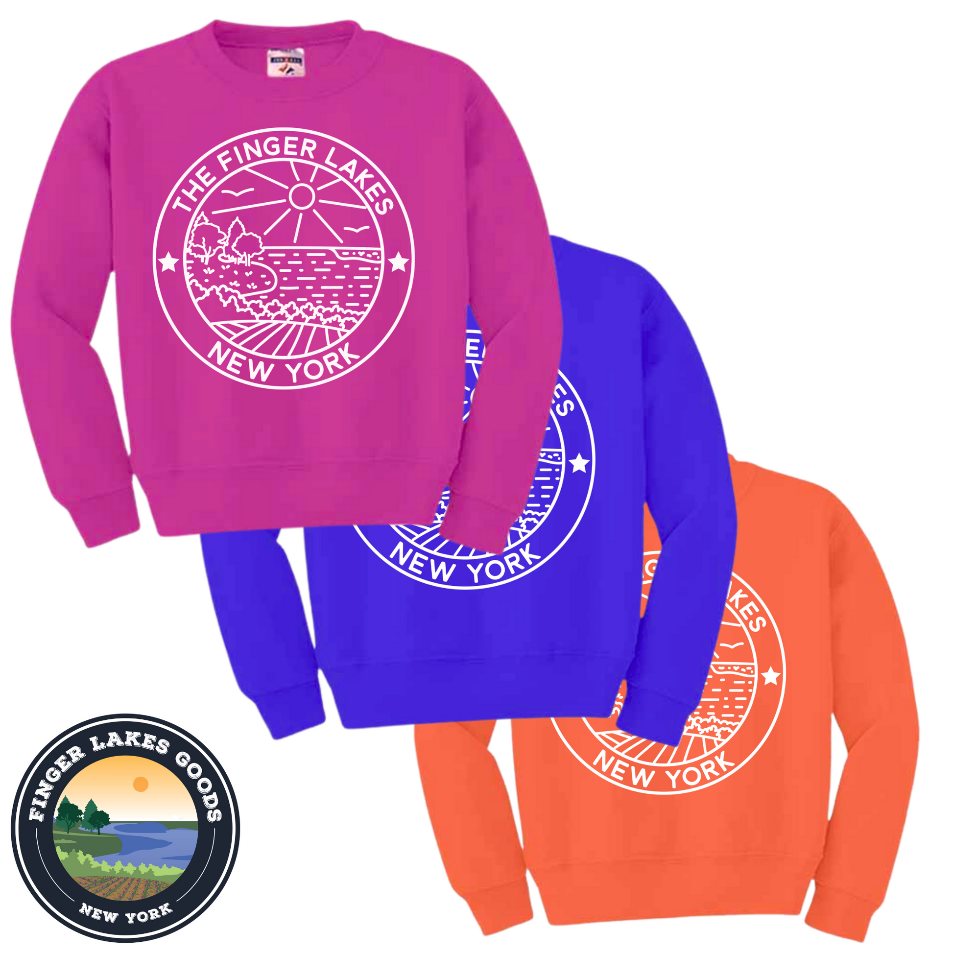 Fun, stylish and comfy Youth Finger Lakes crewneck. Exclusive to Finger Lakes Goods!